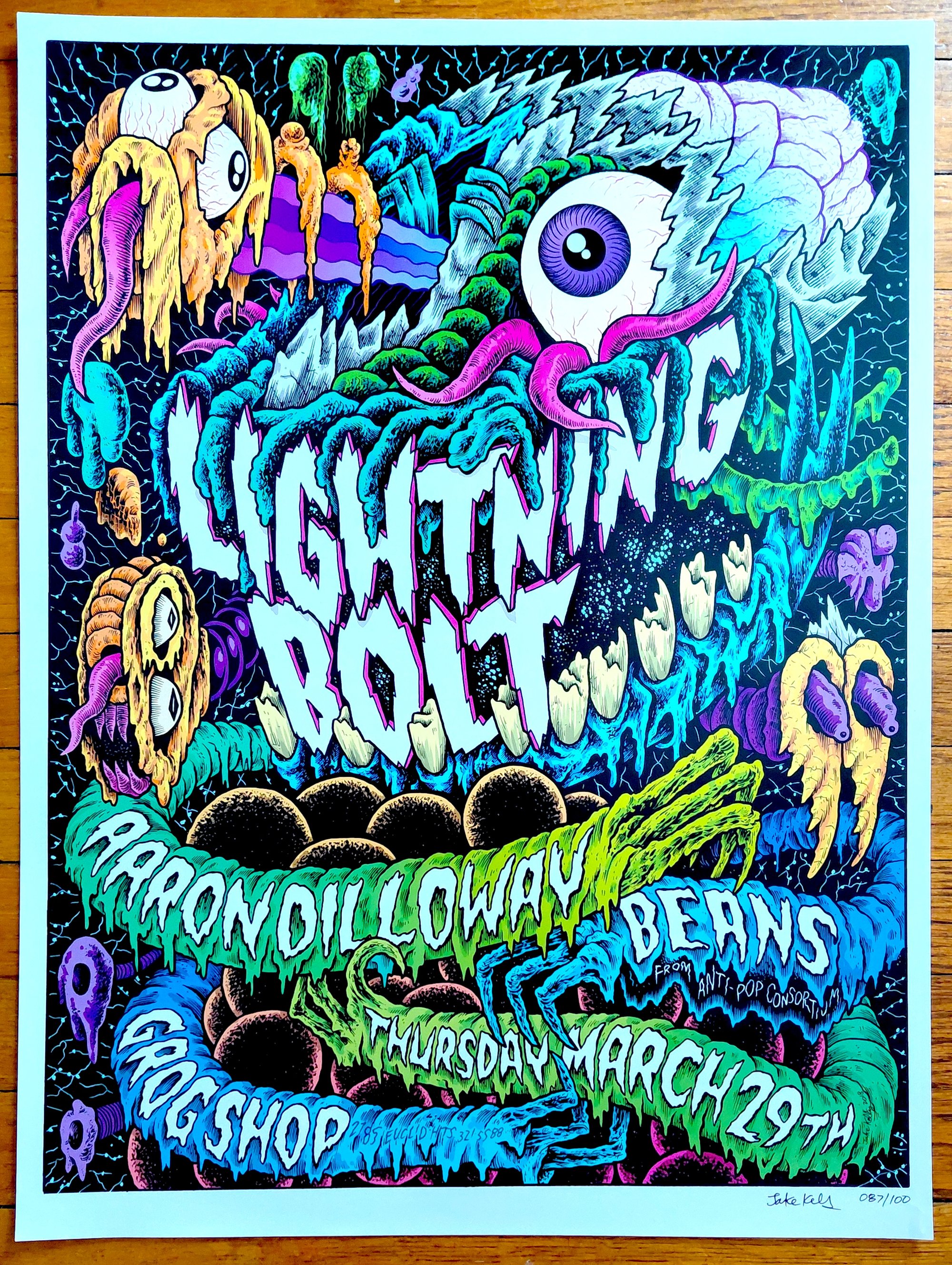 Poster for Lightning Bolt, Aaron Dilloway, and Beans at the Grog Shop, 2013. Glossy color on 18in x 24in 100lb paper.