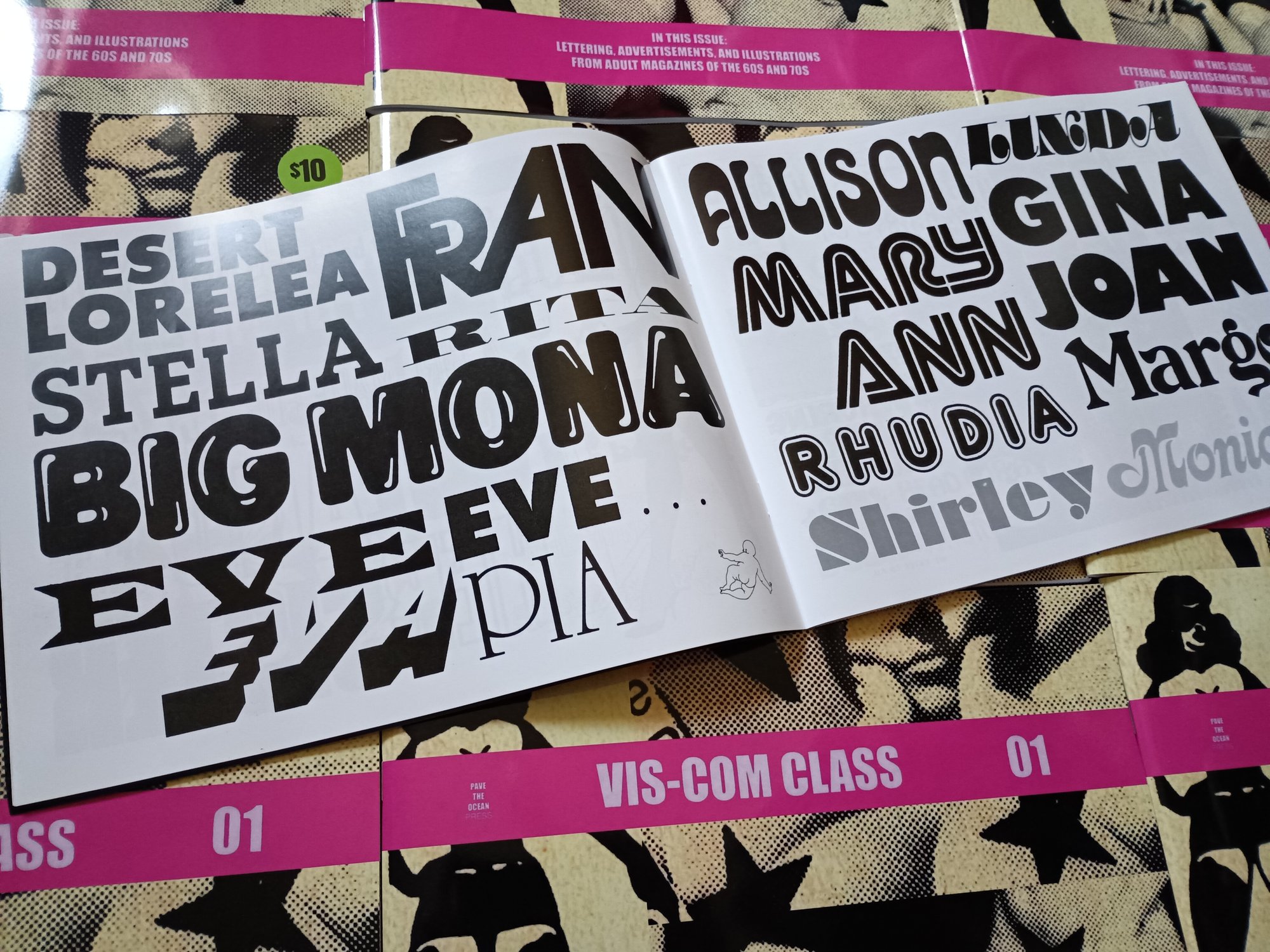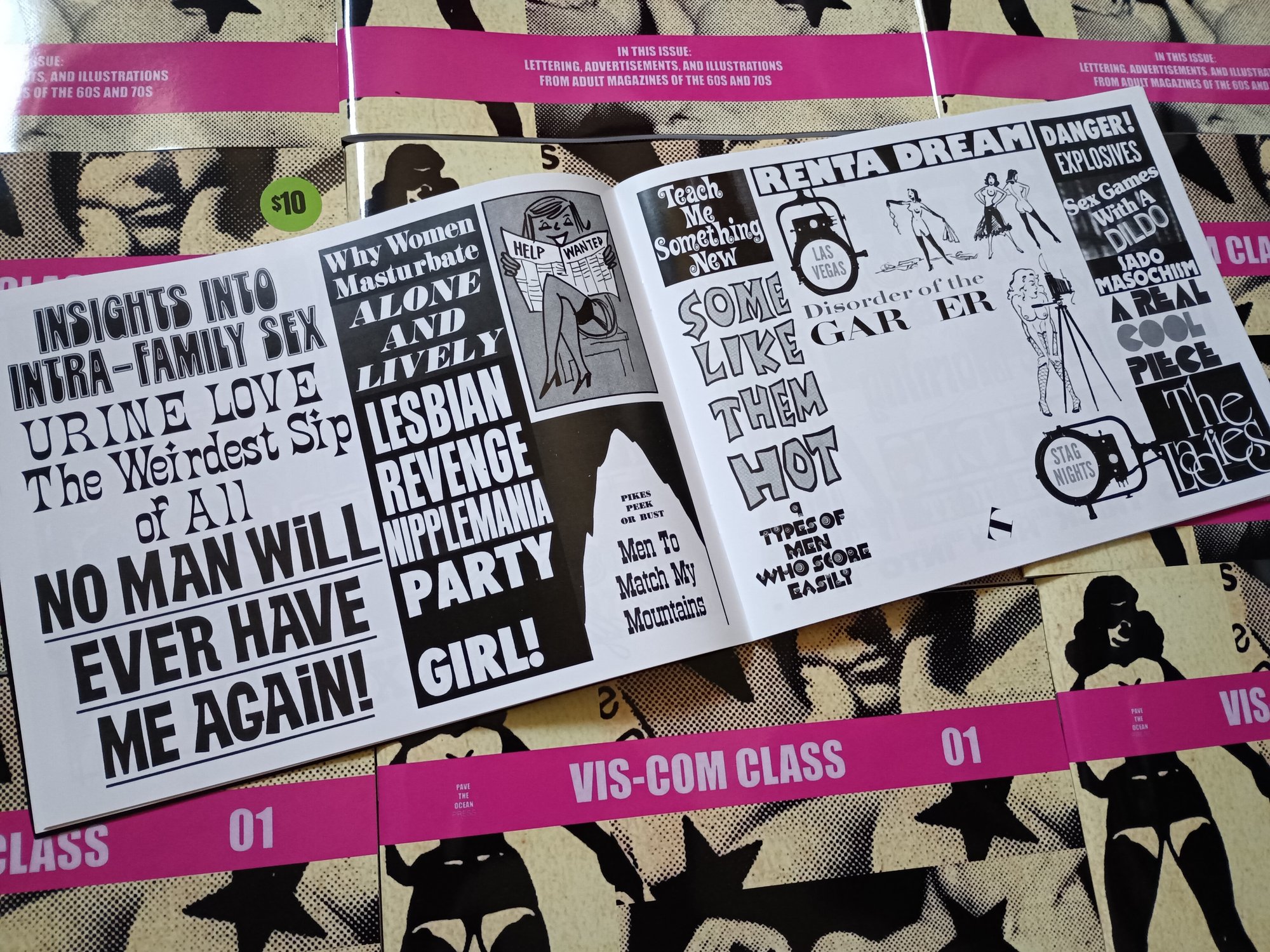 Vis-Com Class is a periodical devoted to graphic art, illustration, and design. This premier issue focuses on illustration, lettering, and advertisements from adult magazines of the 1960s and 1970s. Created in the spirit of Craphound and Rian Hughes’ Custom Lettering series. 60 pages, black and white, 8.5”x11”, landscape orientation